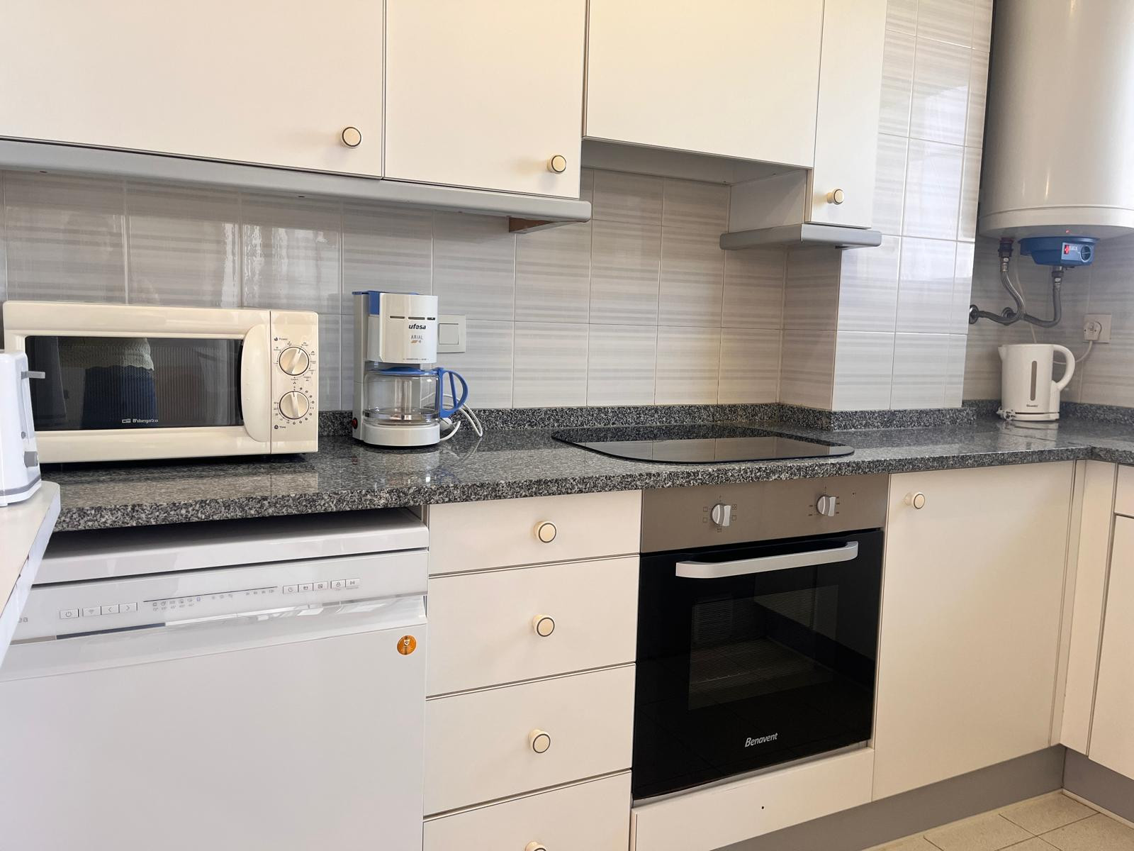 La cocina americana, de vitrocerámica, está equipada con nevera, microondas, horno, vajilla/cubertería, utensilios de cocina, cafetera, tostadora y hervidor de agua.